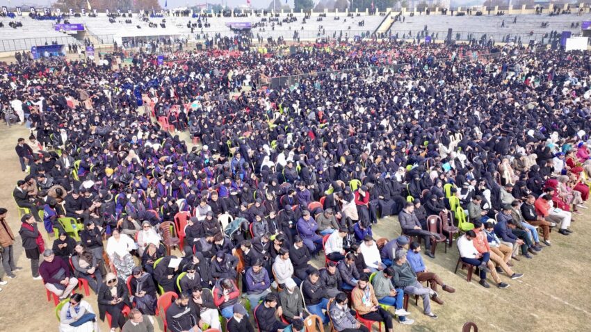 With drug abuse emerging as one of the most urgent challenges facing Kashmir’s youth, a powerful countercurrent of hope and resolve took shape at Bakshi Stadium, with over 20,000 students from 50 colleges and four universities gathered for a special EduYouth Meet in Gurudev’s presence, pledging together to create a Drug-Free Kashmir, in an event organised by Department of Higher Education, Government of J&K