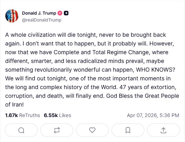 “A whole civilisation will die tonight, never to be brought back again. I don’t want that to happen, but it probably will,” Trump wrote, reflecting the gravity of the ongoing military standoff. The statement comes amidst reports of US strikes on Kharg Island and other strategic Iranian infrastructure.