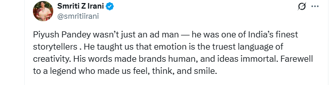 “Piyush Pandey wasn’t just an ad man — he was one of India’s finest storytellers . He taught us that emotion is the truest language of creativity. His words made brands human, and ideas immortal. Farewell to a legend who made us feel, think, and smile,” she posted on X.