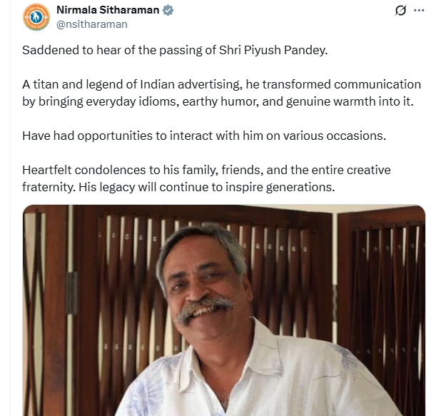 Paying her condolences, Finance Minister Nirmala Sitharaman on X wrote, “Saddened to hear of the passing of Shri Piyush Pandey. A titan and legend of Indian advertising, he transformed communication by bringing everyday idioms, earthy humor, and genuine warmth into it. Have had opportunities to interact with him on various occasions. Heartfelt condolences to his family, friends, and the entire creative fraternity. His legacy will continue to inspire generations.”