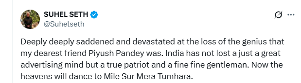 The news of Piyush Pandey’s demise was shared by columnist Suhel Seth on X on Friday morning.