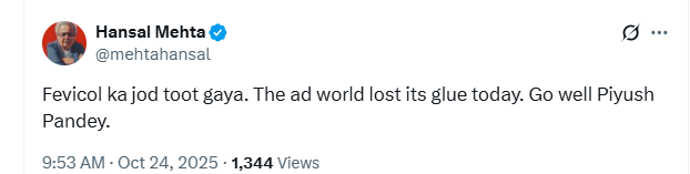 “Fevicol ka jod toot gaya. The ad world lost its glue today. Go well Piyush Pandey,” Mehta wrote.