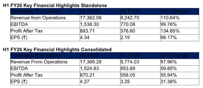 On a consolidated basis, revenue from operations in H1 FY26 stood at ₹17,369.28 lakhs, up 97.96% YoY. EBITDA increased ₹953.69 to ₹1,524.83 lakhs with a margin of 8.78%. PAT rose ₹558.05 to ₹870.21 lakhs with a margin of 5.01%, while EPS improved ₹3.25 to ₹4.27, highlighting sustained profitability.