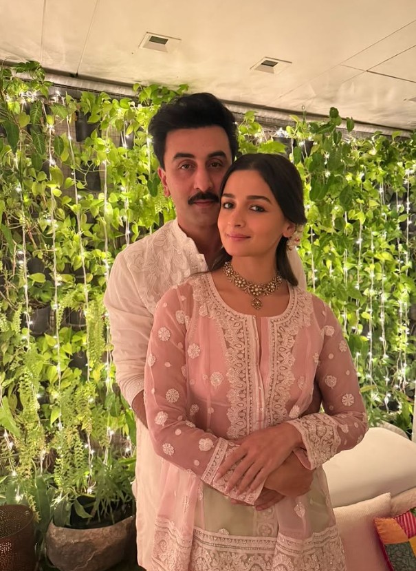 Taking to her Instagram handle, she shared a series of photos, with the first one showing Alia and Ranpir posing for the camera. While Ranbir opted for a white Kurta, Alia looked stunning in a pink kurti with a light green pleated skirt.