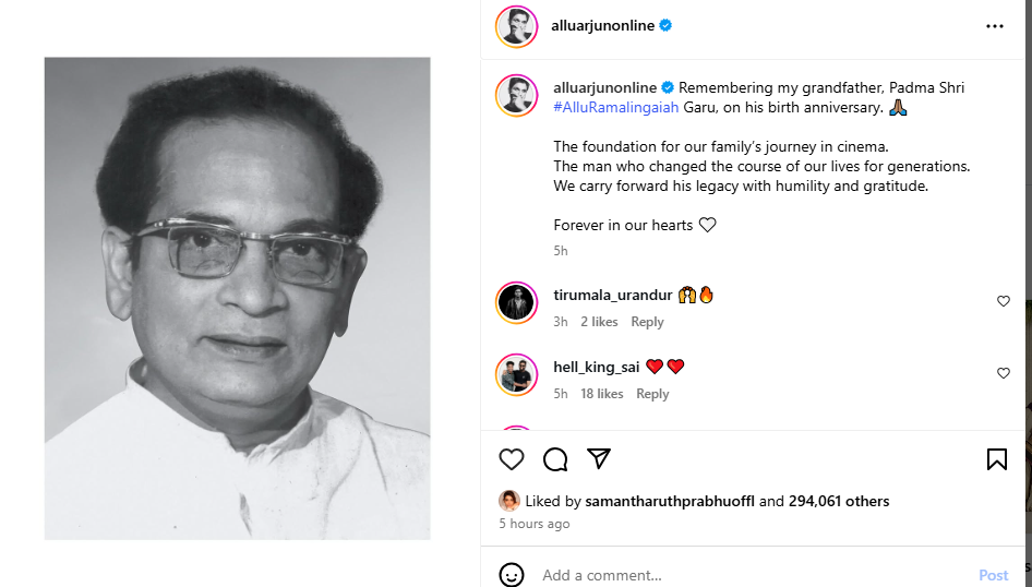 Taking to Instagram, the ‘Pushpa’ star wrote, “Remembering my grandfather, Padma Shri #AlluRamalingaiah Garu, on his birth anniversary. The foundation for our family’s journey in cinema.