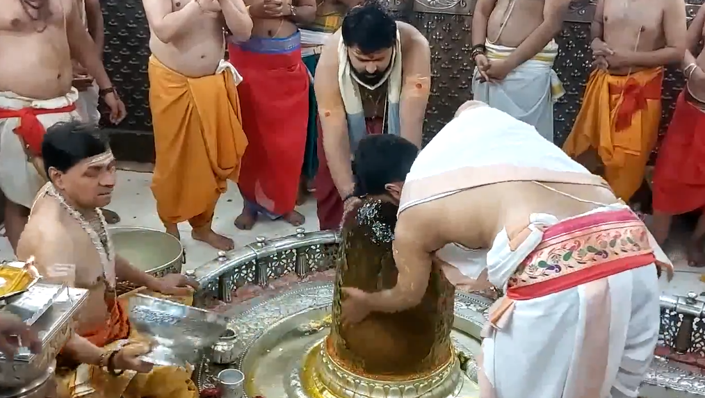 The ritual begins with the opening of the temple doors in the early hours, followed by a ceremonial bath of the deity using Panchamrit, a sacred mixture of milk, curd, ghee, sugar, and honey.