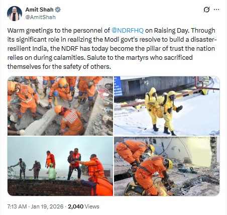 “Warm greetings to the personnel of @NDRFHQ on Raising Day. Through its significant role in realising the Modi govt’s resolve to build a disaster-resilient India, the NDRF has today become the pillar of trust the nation relies on during calamities. Salute to the martyrs who sacrificed themselves for the safety of others,” Shah wrote in the post.
