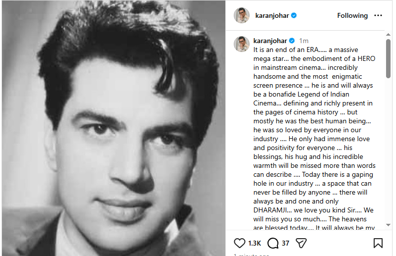 “It is an end of an ERA….. a massive mega star… the embodiment of a HERO in mainstream cinema… incredibly handsome and the most enigmatic screen presence … he is and will always be a bonafide Legend of Indian Cinema… defining and richly present in the pages of cinema history … but mostly he was the best human being… he was so loved by everyone in our industry ….,” Karan’s Instagram post read.