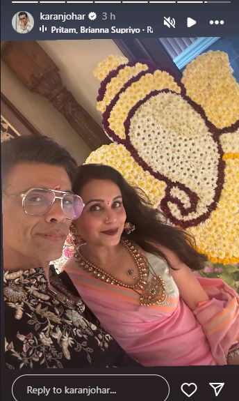 Filmmaker Karan Johar shares a heartwarming moment from his Ganesh Chaturthi celebrations, posting a picture with Rani Mukerji on Instagram Story, showcasing their festive cheer.