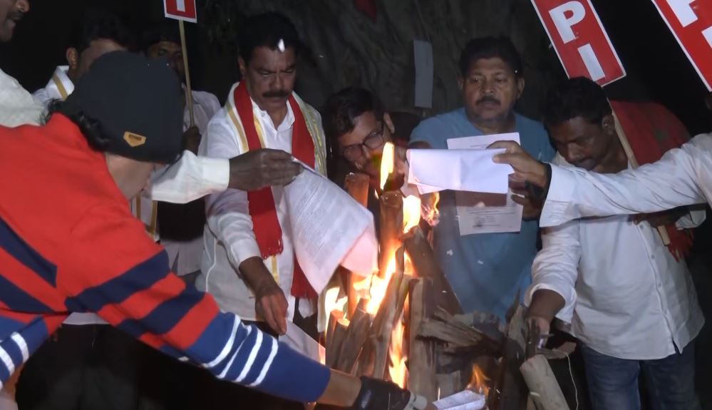 The demonstration was organised by CPI State Secretary G Eswarayya, CPI City Secretary G Koteswara Rao, and other party leaders, during which Government Orders (GOs) Nos. 847 and 590 were set on fire symbolically.