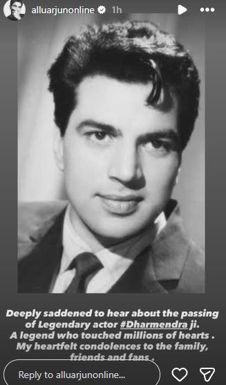 While calling him a legend, the ‘Pushpa’ star wrote, “Deeply saddened to hear about the passing of Legendary actor Dharmendra ji. A legend who touched millions of hearts. My heartfelt condolences to the family, friends and fans.”