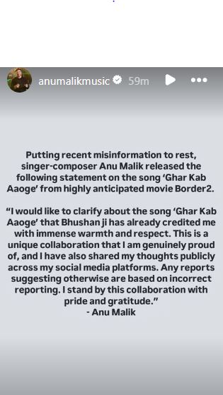 “Putting recent misinformation to rest, singer-composer Anu Malik released the following statement on the song ‘Ghar Kab Aaoge’ from highly anticipated movie Border 2. I would like to clarify about the song ‘Ghar Kab Aaoge’ that Bhushan ji has already credited me with immense warmth and respect. This is a unique collaboration that I am genuinely proud of, and I have also shared my thoughts publicly across my social media platforms. Any reports suggesting otherwise are based on incorrect reporting. I stand by this collaboration with pride and gratitude,” the statement read.