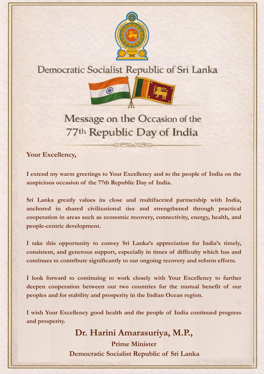 The Prime Minister of Sri Lanka, in an official message, said, ” I extend my warm greetings to Your Excellency and to the people of India on the auspicious occasion of the 77th Republic Day of India.”