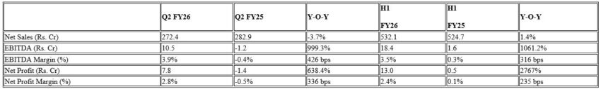 * In H1 FY26, the Company reported a net profit of Rs. 13.0 crore, EBITDA of Rs. 18.4 crore, and net sales of Rs. 532.1 crore.