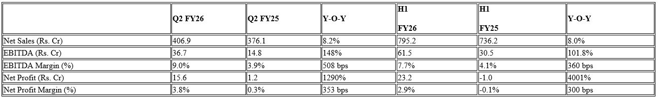 In H1 FY26, on a consolidated basis, the Company reported a net profit of Rs. 23.2 crore, EBITDA of Rs. 61.5 crore, and net sales of Rs. 795.1 crore.
