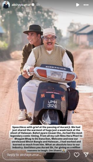 Actor Akshay Kumar, known for working with Asrani in several hit films, led the lines of tributes with an emotional message. Remembering their films, Akshay described his passing as an “absolute loss” to the film industry. He also confirmed working with the late actor in Priyadarshan’s upcoming films, ‘Bhoot Bangla’ and ‘Haiwaan’.