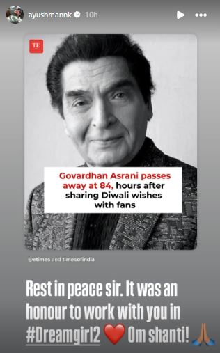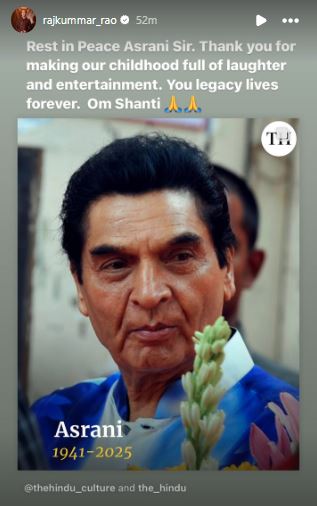 “Rest in Peace Asrani Sir. Thank you for making our childhood full of laughter and entertainment. Your legacy lives forever. Om Shanti,” Rajkummar Rao wrote in his Instagram story.