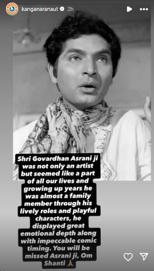 Actor-politician Kangana Ranaut paid homage to Asrani’s cinematic legacy, reflecting on the late actor was a part of her growing up years.