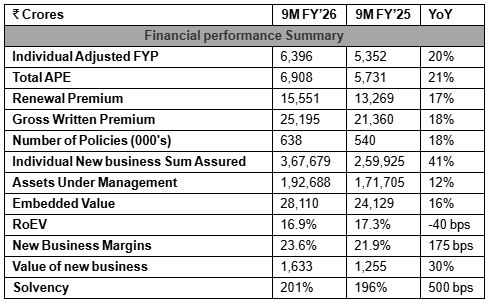 Further, in 9M FY’26, Axis Max Life’s individual renewal premium grew by 17% to ₹15,551 crores, taking the Gross Written Premium to ₹25,195 crores, an 18% YoY increase. Additionally, the Company has reported New Business Margins of 23.6% in 9M FY’26 up from 21.9% during the same period last year. The Value of New Business, a measure of profitability, experienced a YoY growth of 30%, aided by improvements in product mix. Axis Max Life led the industry in Retail protection sales and has maintained leadership in the online market, in both protection and savings categories.