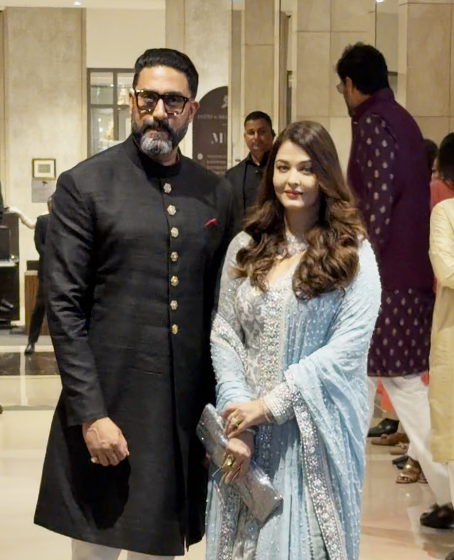 Actors Abhishek Bachchan and Aishwarya Rai Bachchan were also among the prominent attendees. The duo posed for photographers outside the venue, with Aishwarya wearing a light blue Anarkali featuring silver detailing and Abhishek opting for a black kurta paired with white trousers.
