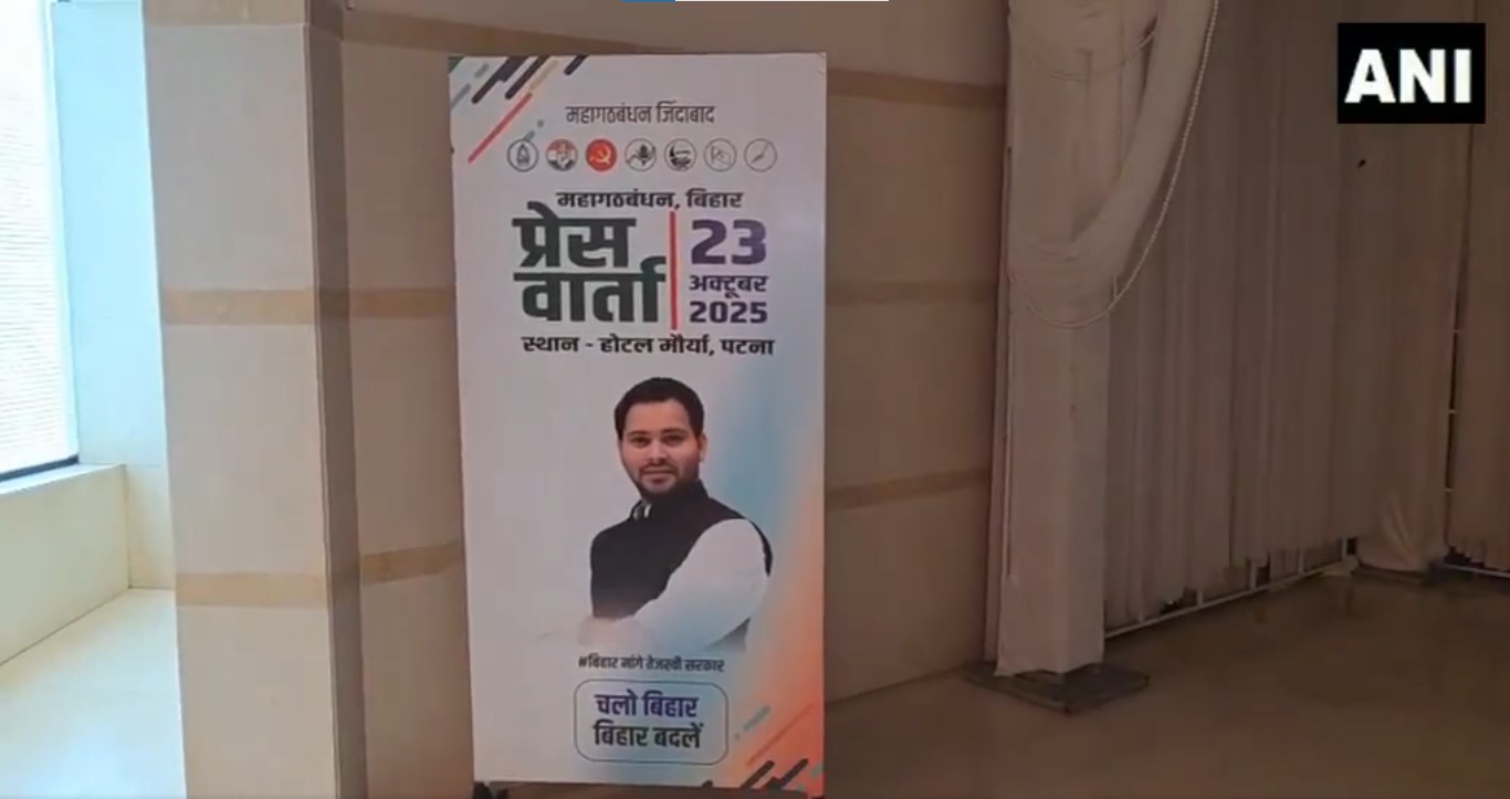 Patna (Bihar) [India], October 23 (ANI): As the Bihar assembly elections come closer, the Mahagathbandhan press conference will be held on Thursday to announce the final shape of the alliance. Boards and posters with photos of Rashtriya Janata Dal (RJD) leader and Raghopur constituency candidate Tejashwi Yadav have been put up at the venue.
