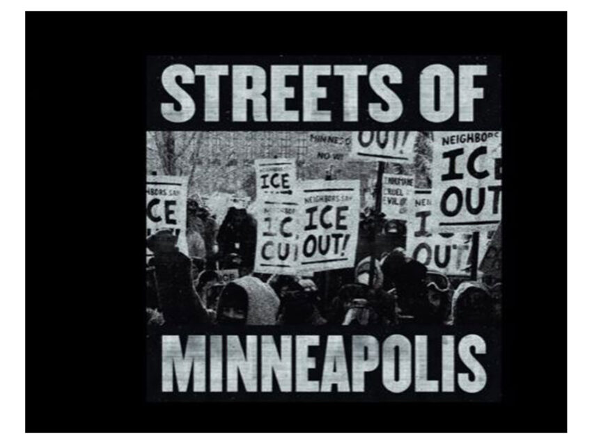 The song opens with a full-band arrangement, followed by sing-along moments as the lyrics play out, “Through the winter’s ice and cold/ Down Nicollet Avenue/ A city aflame fought fire and ice/ ‘Neath an occupier’s boots/ King Trump’s private army from the DHS/ Guns belted to their coats/ Came to Minneapolis to enforce the law/ Or so their story goes.”