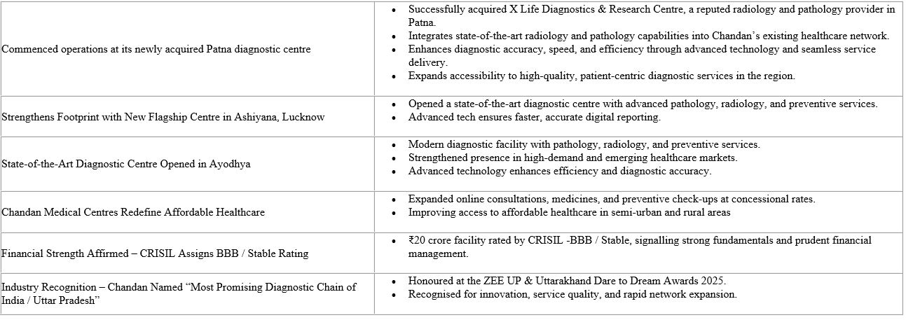Looking ahead, we plan to accelerate our pan-India expansion through a mix of owned and franchise-led centres. Chandan Healthcare has also entered into an exclusive strategic partnership with Jeena Sikho Lifecare Limited to establish diagnostic centres across all existing and upcoming Jeena Sikho hospitals and clinics across India. Jeena Sikho Lifecare Limited (JSLL) is one of India’s leading Ayurvedic healthcare providers with over a decade of experience in holistic wellness. With a clear strategy and strong foundation, Chandan Healthcare remains focused on steady, profitable, and sustainable growth in the years ahead.”