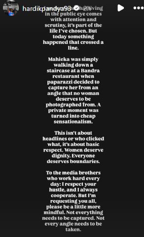 Taking to his Instagram, Hardik Pandya addressed a recent incident in which Mahieka was allegedly photographed from an “angle no woman deserves to be photographed” while walking down a staircase at a Bandra restaurant.