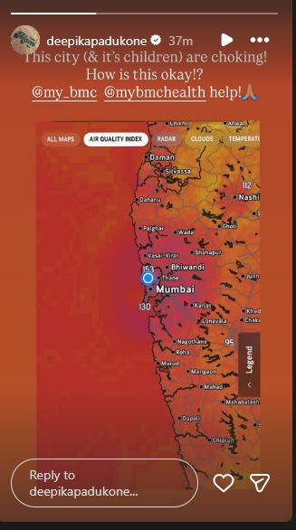 Deepika posted a screengrab of Mumbai’s pollution levels. Along with the picture, she tagged the city’s civic body, the Brihanmumbai Municipal Corporation (BMC), and asked officials to look into the matter.