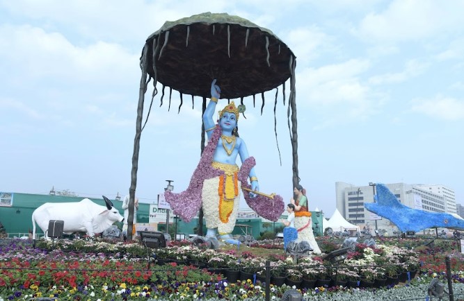 The ‘Shashvat Bharat’ zone showcasing India’s mythological heritage will also be a major attraction of the flower show. In this spiritually rich zone, mythological episodes such as Samudra Manthan, Gita Saar, Govardhan Leela, descent of Ganga and Ram Setu have been artistically recreated through floral sculptures, connecting visitors with India’s ancient cultural narratives.