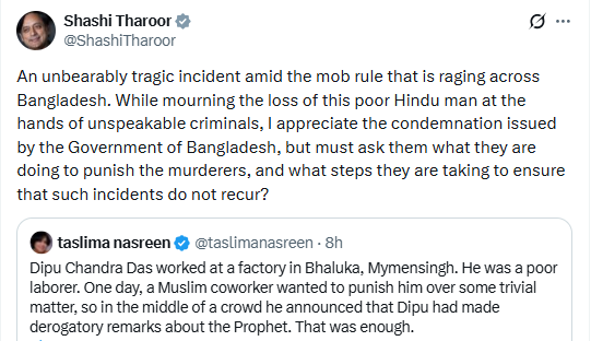 In a post on X, Tharoor wrote, “An unbearably tragic incident amid the mob rule that is raging across Bangladesh. While mourning the loss of this poor Hindu man at the hands of unspeakable criminals, I appreciate the condemnation issued by the Government of Bangladesh…”