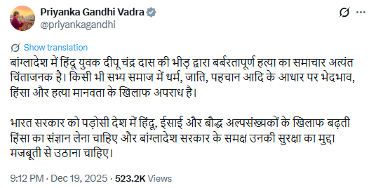 Earlier, commenting on the incident, Congress MP Priyanka Gandhi Vadra urged the Centre to take cognisance of the increasing violence against Hindu, Christian, and Buddhist minorities after the murder of Hindu youth Dipu in Bangladesh.
