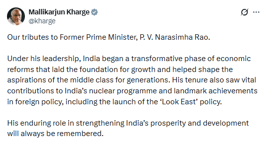 In a post on X, Kharge wrote, “Under his leadership, India began a transformative phase of economic reforms that laid the foundation for growth and helped shape the aspirations of the middle class for generations.”