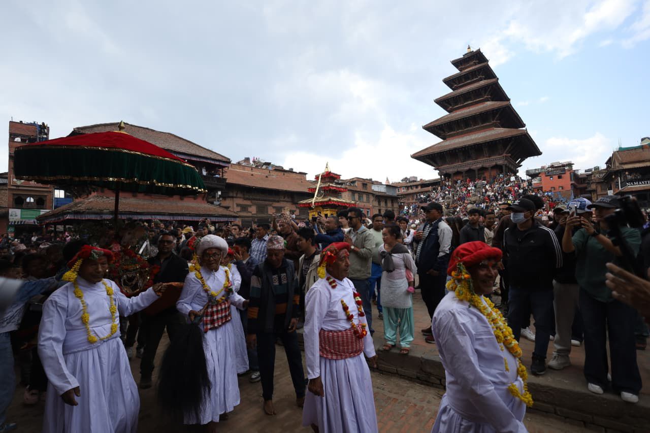 On the first day, Lord Bhairab (Bhaila Kha:) is ascended on a chariot and is toured round the city. It is pulled by two groups one on the upper side of Nyatapola Temple and other on the lower side, the tug of war continues for hours and days. It finally is rested in front of temple near the Nyatapola and is worshipped by all.