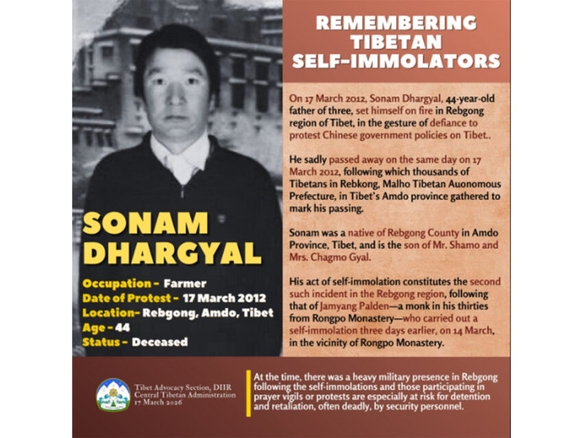 In a post shared on social media platform X, the Tibetan government-in-exile paid tribute to those who carried out self-immolation protests against Chinese government policies in Tibet. The post recalled that on March 17, 2012, Sonam Dhargyal, a 44-year-old father of three, set himself on fire in the Rebgong region of Tibet as an act of defiance. He succumbed to his injuries the same day. Following his death, thousands of Tibetans gathered in Rebgong, located in the Malho Tibetan Autonomous Prefecture in Amdo province, to mourn and mark his passing.