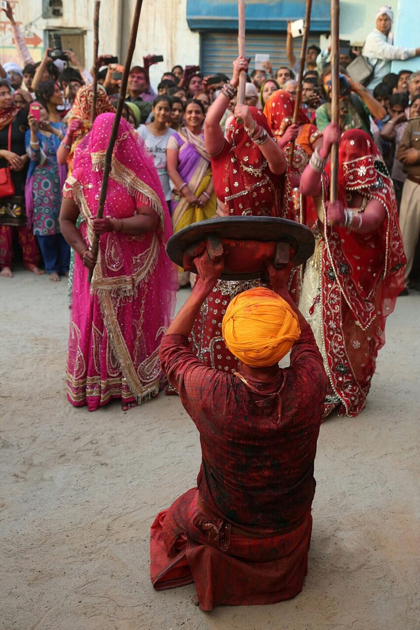 Holi in Haryana is famous for mock battles between family members. Devar – Bhabhi Mock-Battles feature married women (bhabhis) playfully take revenge for mischief by beating their younger brothers-in-law (devars) with rolled-up saris or sticks. However, in urban areas like Gurugram and Faridabad, modern Holi celebrations feature DJs, rain dances, and culinary bazaars.