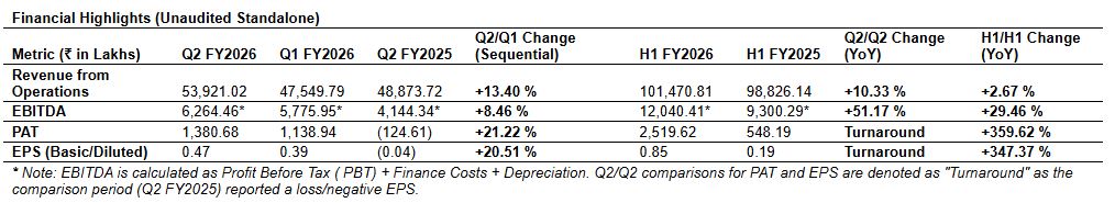 * Q2 PAT registered a strong turnaround to ₹13.81 crore (Q2 FY2025: loss of ₹1.25 crore) and rose 21.22% QoQ (Q1 FY2026: ₹11.39 crore).