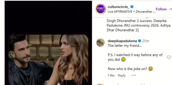 Taking to her Instagram handle, Deepika Padukone commented on a reel on social media which highlighted her absence at the Dhurandhar 2’s screening and asked if “her silence was a delivery statement or is it the internet reading too much into celebrity social media silence?”