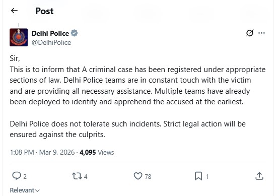 In a post on X, Delhi Police said, “Sir, this is to inform that A criminal case has been registered under appropriate sections of law. Delhi Police teams are in constant touch with the victim and are providing all necessary assistance. Multiple teams have already been deployed to identify and apprehend the accused at the earliest. Delhi Police does not tolerate such incidents. Strict legal action will be ensured against the culprits.”