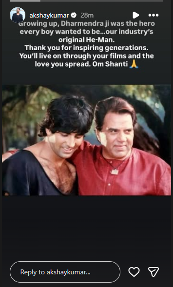 Many film personalities have extended their condolences on social media platforms. Actor Akshay Kumar remembered Dharmendra with a gratitude post.