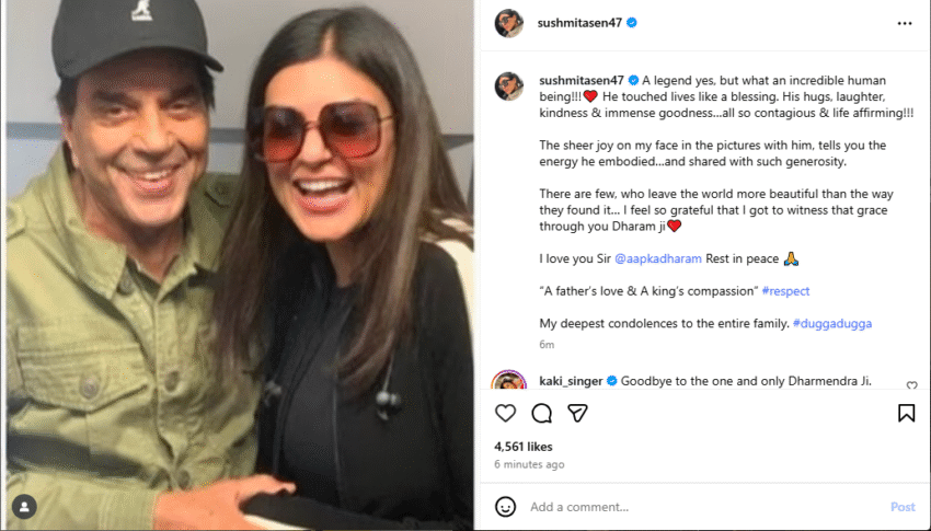 In her Instagram post, actor Sushmita Sen described Dharmendra as an incredible human being who touched lives like a blessing.