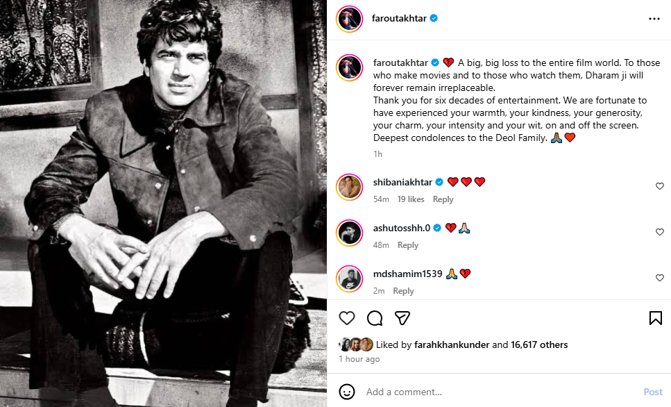 “A big, big loss to the entire film world. To those who make movies and to those who watch them, Dharam ji will forever remain irreplaceable. Thank you for six decades of entertainment. We are fortunate to have experienced your warmth, your kindness, your generosity, your charm, your intensity and your wit, on and off the screen. Deepest condolences to the Deol Family,” he wrote on Instagram.
