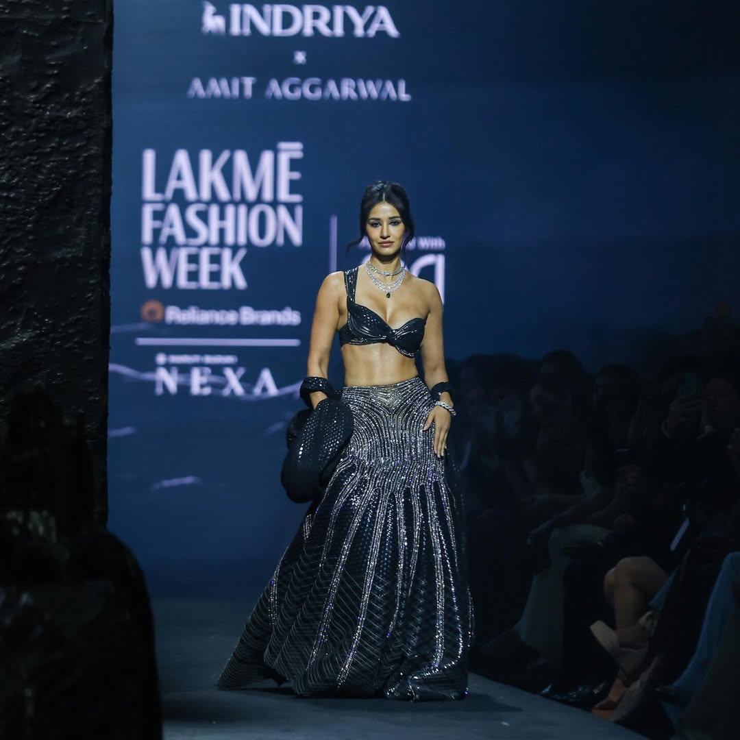 The actor walked the ramp in a stunning black ensemble paired with a blouse and a statement dupatta wrapped around her hands. She kept her hair tied in a bun with loose strands. For jewellery, Disha wore a layered diamond necklace with an emerald pendant.