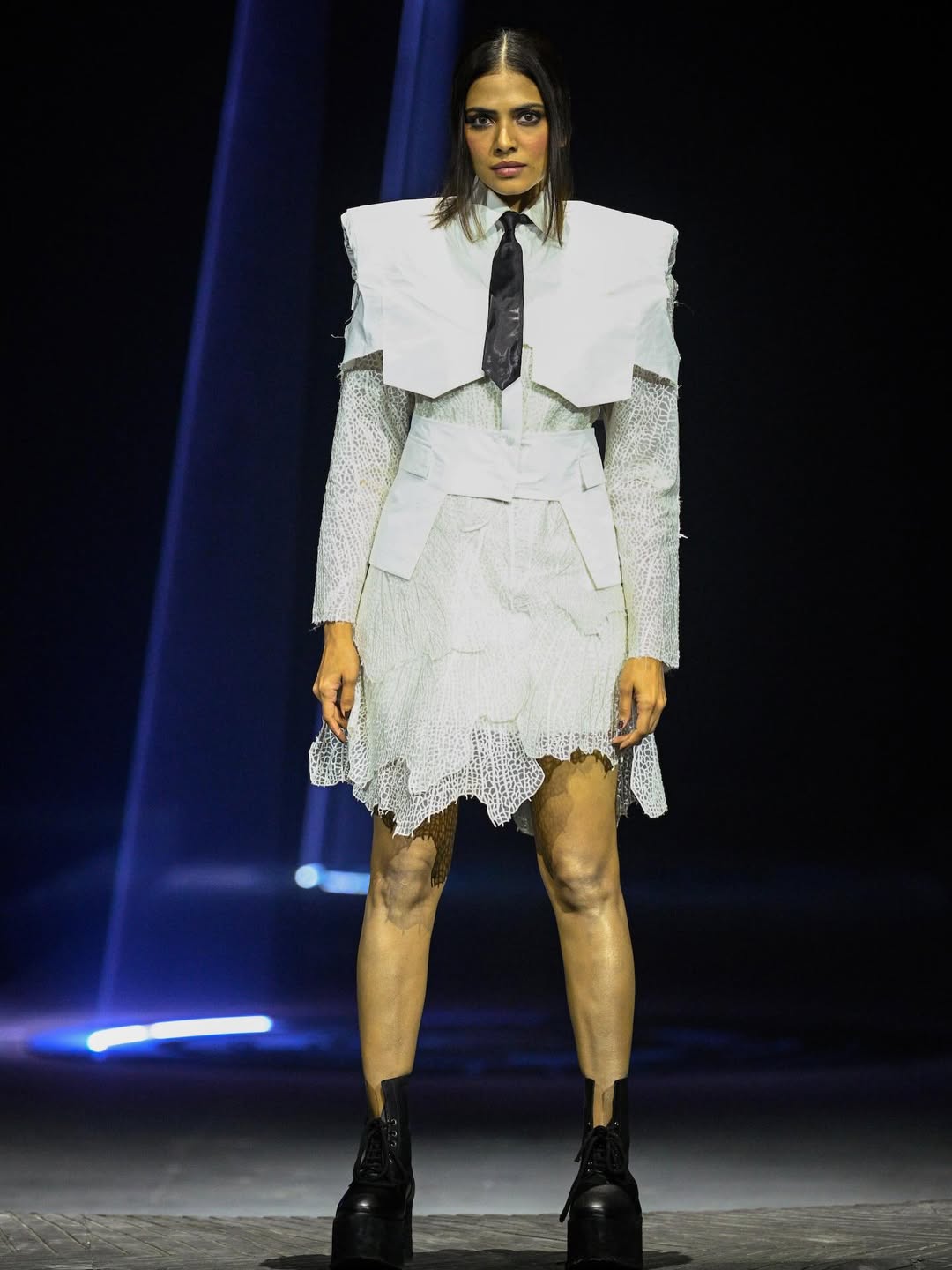 Actress Malavika Mohanan closed the show with her striking walk in Gupta’s all-white ensemble. She was dressed in a structured, collared, cropped jacket layered over a crisp white shirt, paired with a matching asymmetric knee-length skirt.