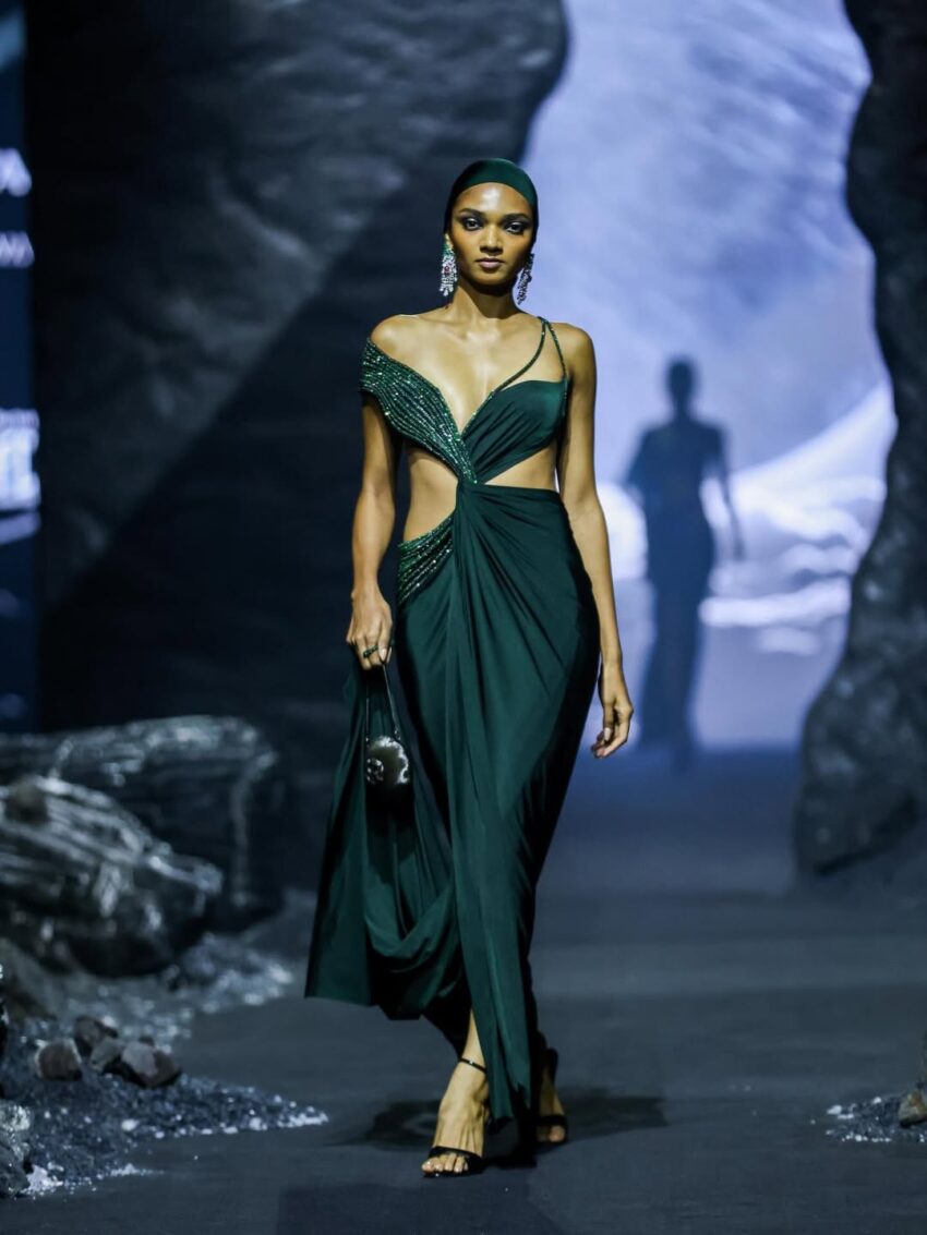 The showcase began with refined diamond pieces in minimal compositions, capturing the first hints of illumination, gradually transitioning into statement Polki and gold creations. Also, jewel tones, reflective surfaces, crystal embellishments, and reinterpreted heritage textiles begin to emerge. As light interacts with form, the narrative evolves into one of confidence and self-expression.