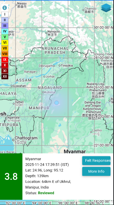 The post read, “EQ of M: 3.8, On: 24/11/2025 17:39:51 IST, Lat: 24.96 N, Long: 95.12 E, Depth: 139 km, Location: Myanmar.”