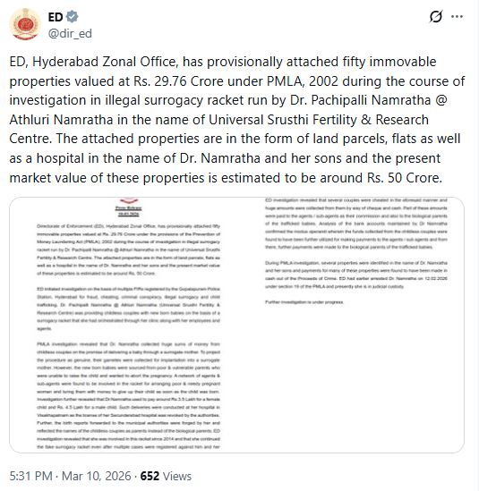 ED, Hyderabad Zonal Office, has provisionally attached fifty immovable properties valued at Rs. 29.76 Crore under PMLA, 2002 during the course of investigation in illegal surrogacy racket run by Dr. Pachipalli Namratha @ Athluri Namratha in the name of Universal Srusthi Fertility… pic.twitter.com/Qm0qoFHyHP