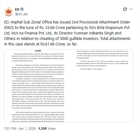 “ED initiated an investigation based on an FIR registered by the CID (Crime Branch), Manipur, under various Sections of IPC, 1860, against Yumnam Irabanta Singh, Director of M/s Birla Emporium Pvt. Ltd. and Ira Finance Pvt. Ltd.. According to the FIRS, Yumnam Irabanta Singh allegedly operated a fraudulent investment/deposit scheme from 2019 to 2021 that promised high returns to investors. Still, finally, he and his associates had siphoned off several individual depositors’ funds,” the agency said in a statement.