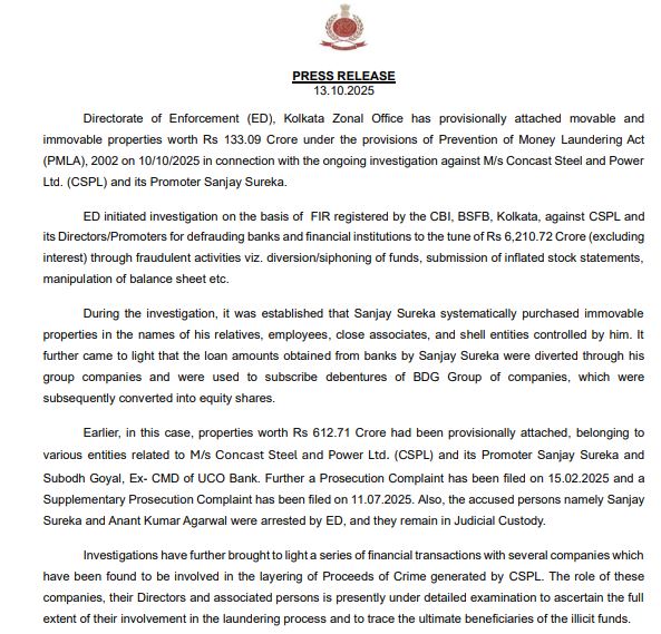 New Delhi [India], October 13 (ANI): The Enforcement Directorate (ED) has attached movable and immovable properties worth Rs 133.09 crore in connection with the ongoing investigation against Concast Steel and Power Ltd (CSPL) and its promoter, Sanjay Sureka, for defrauding banks and financial institutions to the tune of Rs 6,210.72 crore.
