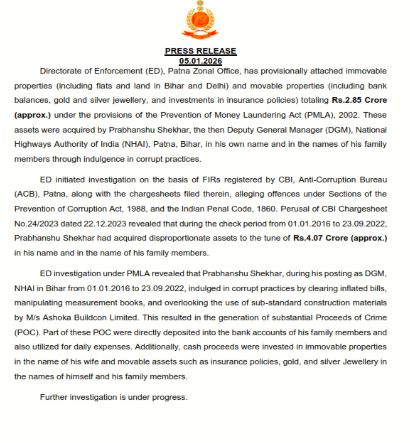 The ED investigation under PMLA revealed that “Prabhanshu Shekhar, during his posting as DGM, NHAI, in Bihar from January 1, 2016, to September 23, 2022, indulged in corrupt practices by clearing inflated bills, manipulating measurement books, and overlooking the use of sub-standard construction materials by Ashoka Buildcon Limited.”